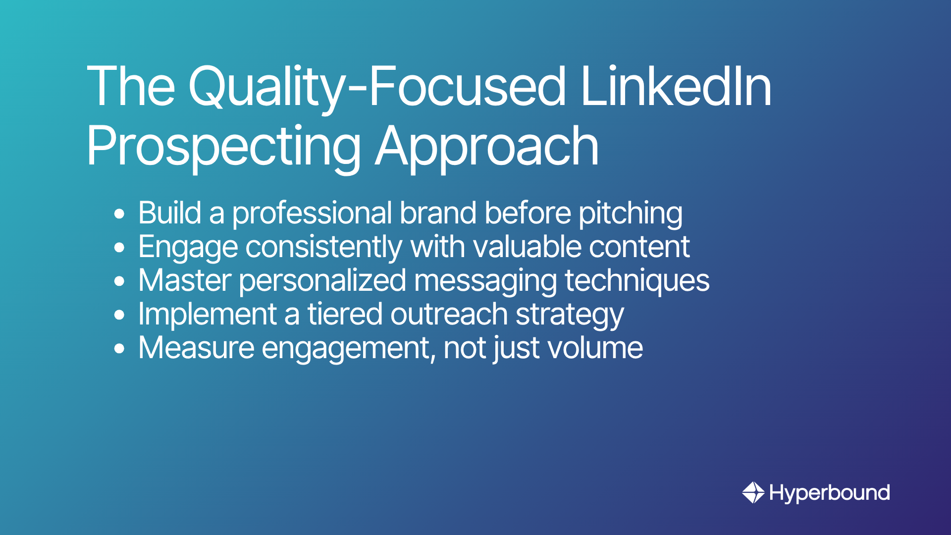 Over time, this approach builds a foundation of trust and reciprocity that makes your eventual ask for a meeting feel like a natural next step rather than a cold pitch from a stranger. And that's the ultimate goal of quality-focused LinkedIn prospecting: transforming cold outreach into warm conversations.