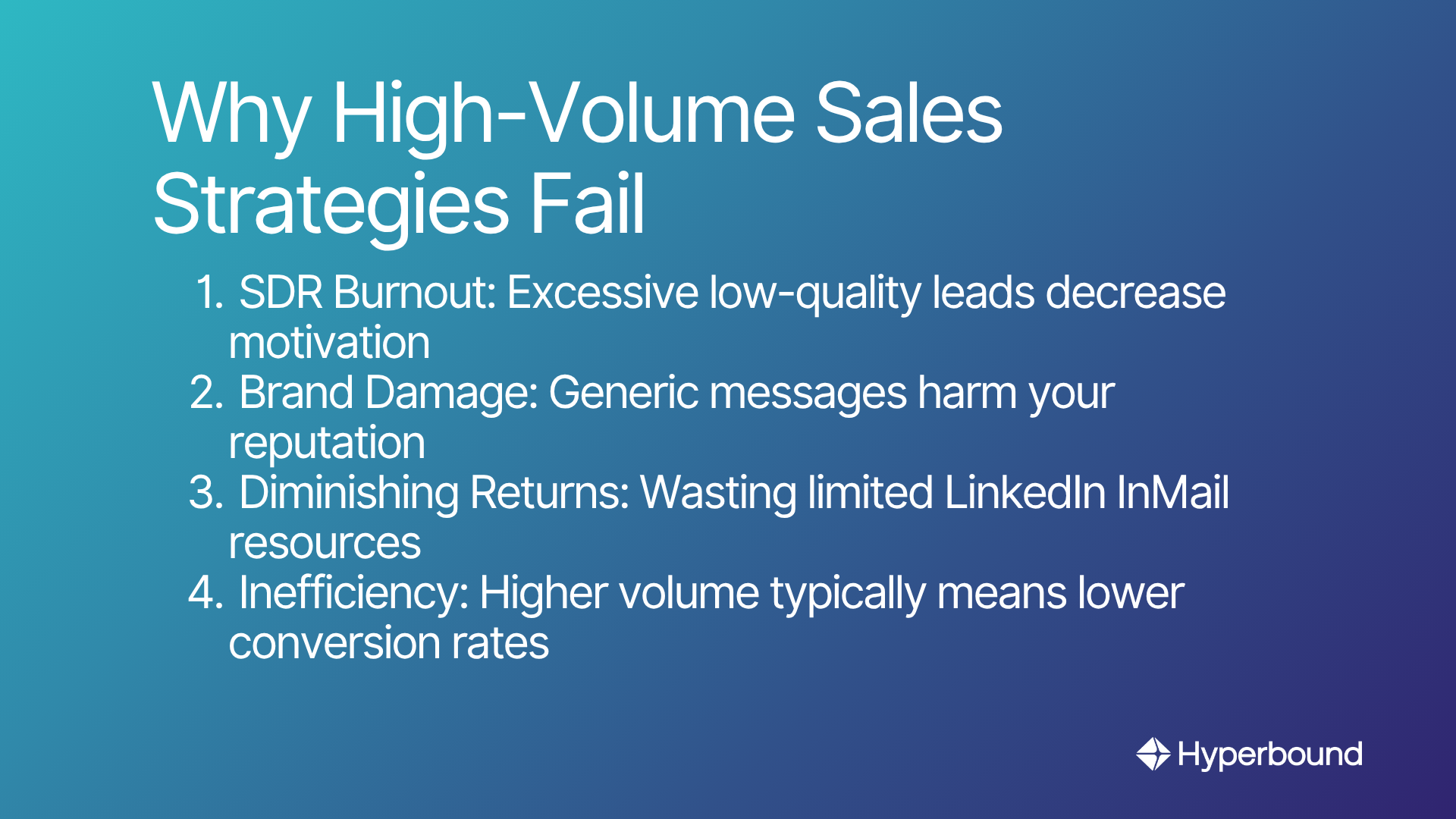 High-volume LinkedIn outreach often fails because it leads to SDR burnout, damages your personal and company brand with generic messages, and yields diminishing returns. Most prospects (around 97%) are not ready to buy at any given time, so impersonal, automated messages are easily ignored and can harm your reputation for future outreach.