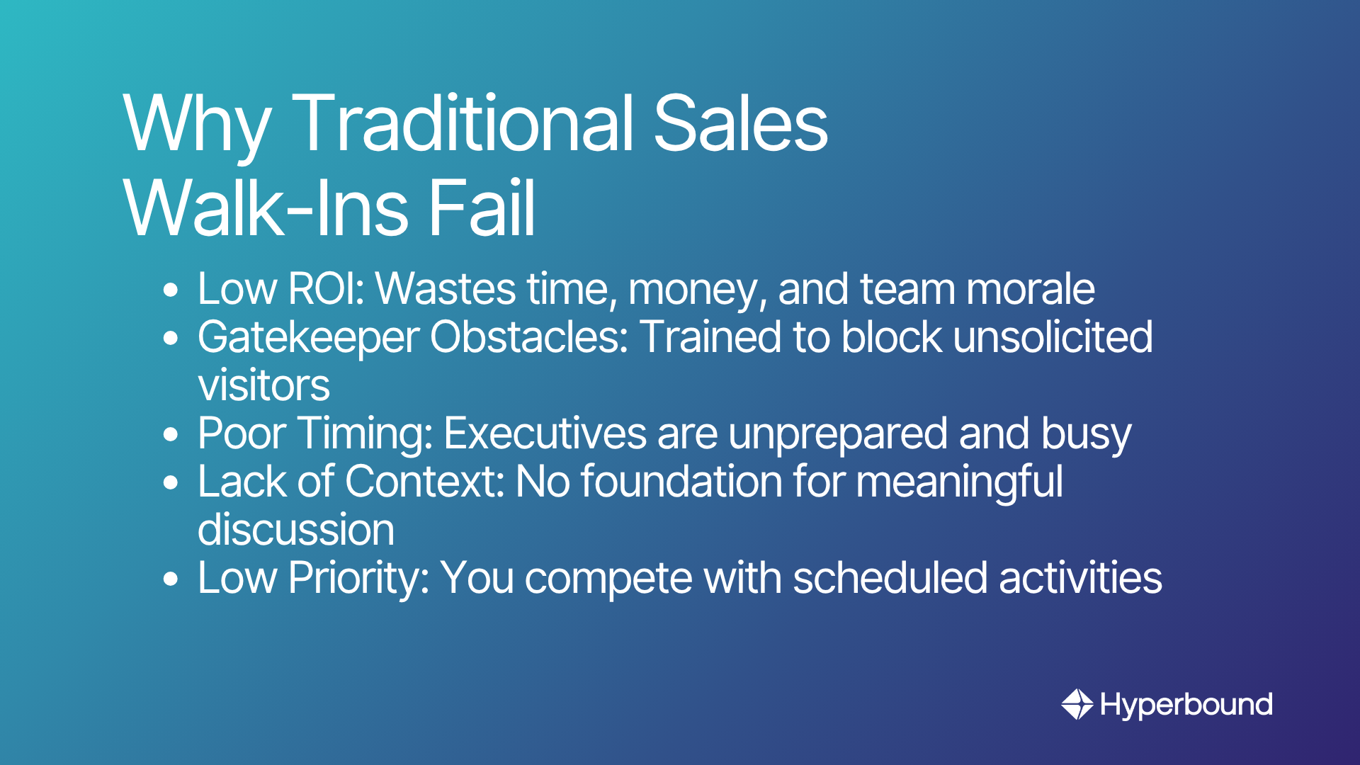 If this scenario sounds painfully familiar, you're not alone. Walk-ins fundamentally have a low ROI as a sales strategy, especially in today's B2B environment where gatekeepers are trained to filter out unsolicited visitors and decision makers have packed calendars.